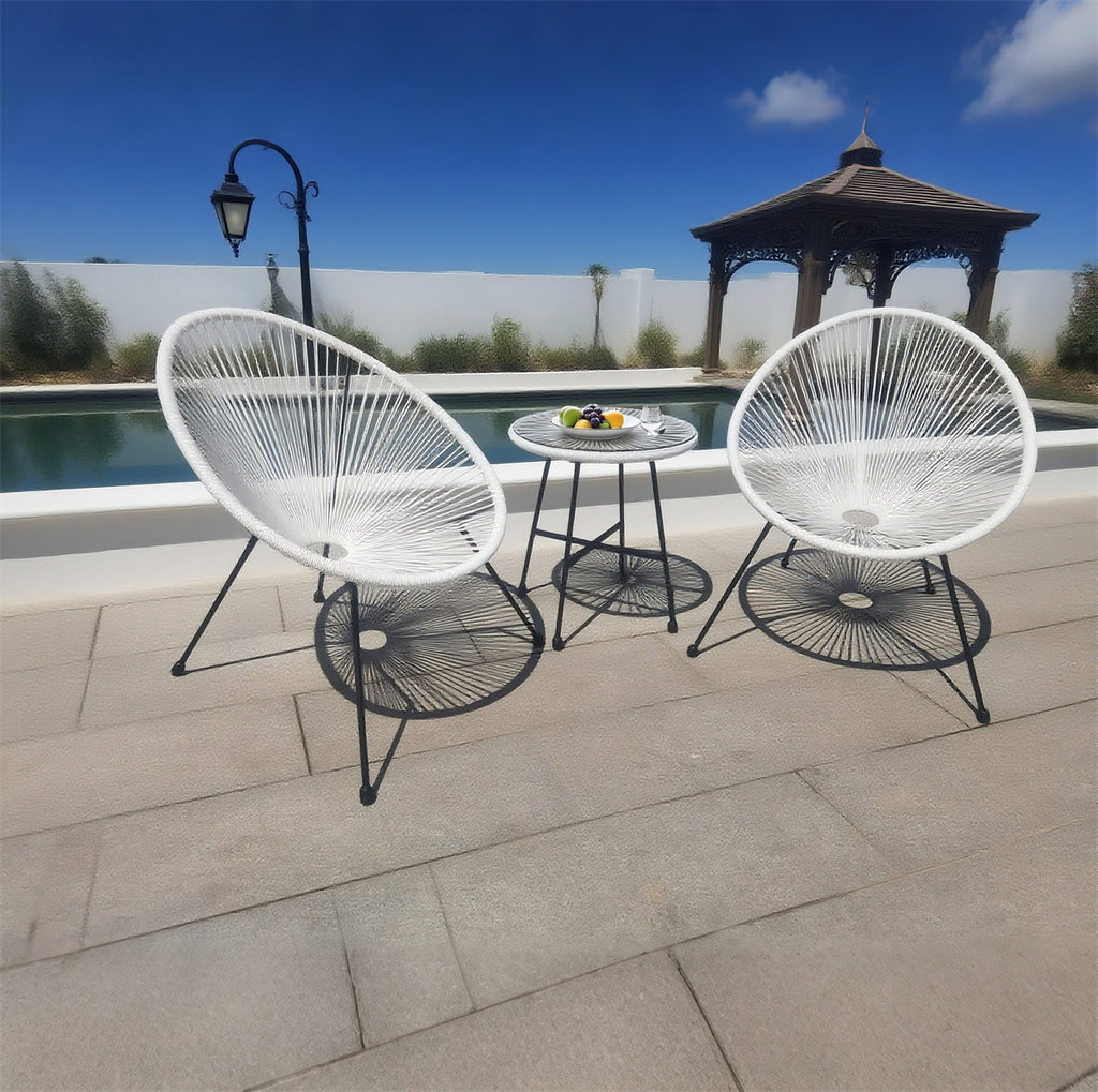 BST250201 White Woven Rope & Black Metal Frame Luxury Poolside Nightscape 2-Piece Outdoor Bistro Set – Glass Round Table