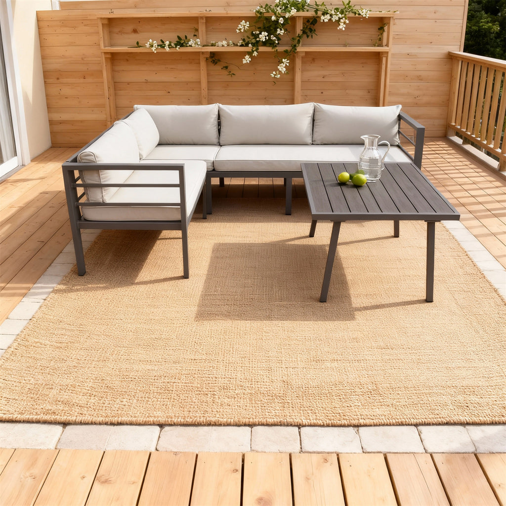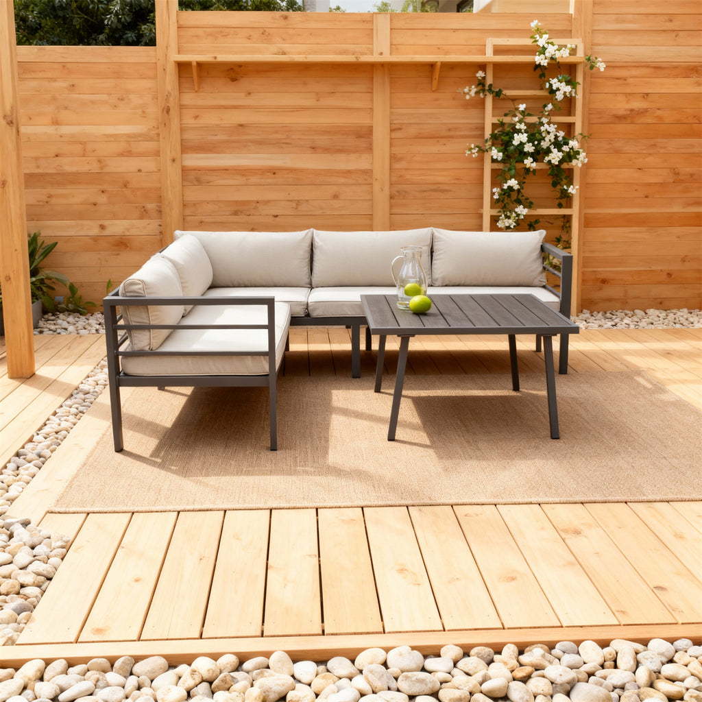 - Dark Grey Metal L-Shaped Sectional for Santa Barbara Entertainment! This set seats 4-5 guests—perfect for backyard gatherings, sunset cocktails, or quiet conversations. The L-shaped corner design creates an intimate conversational zone, while plush beige cushions and a matching square coffee table offer ultimate relaxation, transforming your patio into a sophisticated Californian retreat.