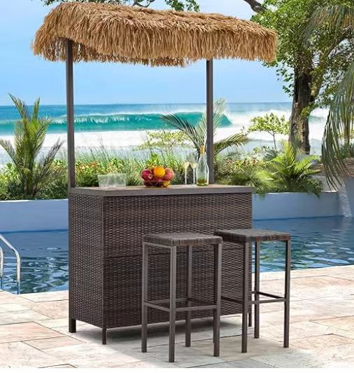 BTY2507 3-Piece Tropical Rattan Bar Set with Palm Roof – Beachfront Poolside Furniture