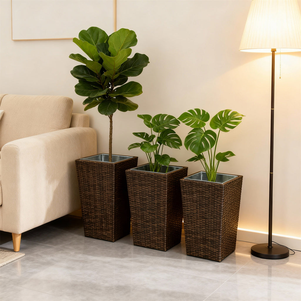 OPB2504 3-Piece Tall Square Wicker Planter Set – Indoor Outdoor Rattan Plant Pot Set