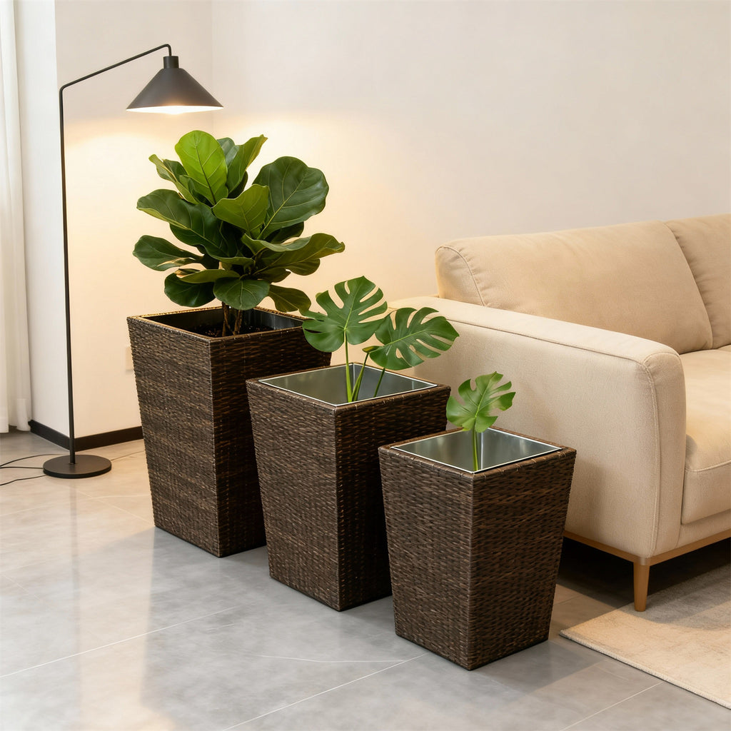 Hand-woven PE rattan exterior with a sleek stainless steel inner liner. The warm brown wicker texture adds a boho, natural touch, while the metal liner prevents soil leakage and simplifies plant care.