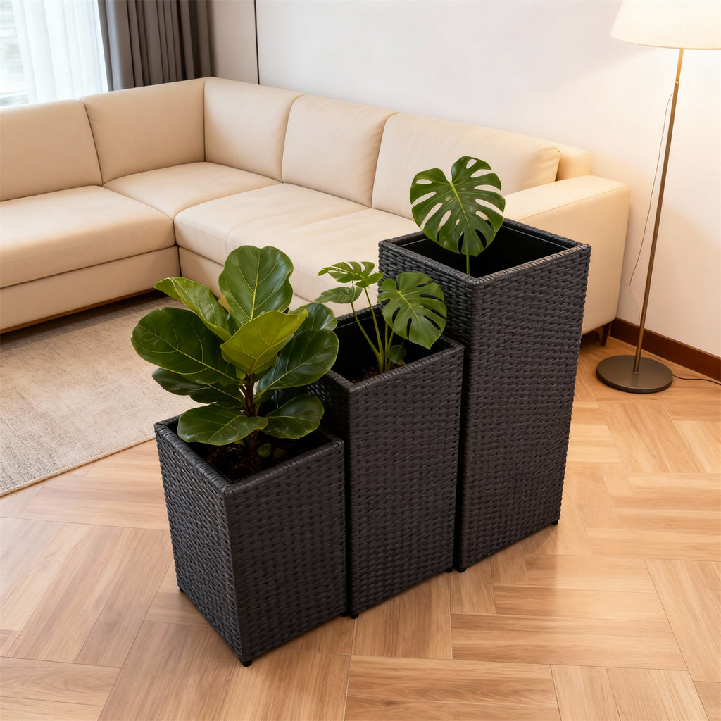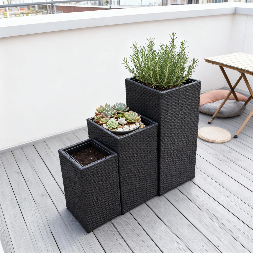 OPB250601 3-Piece Tall Square Black Wicker Planter Set – Modern Patio Plant Pot Set