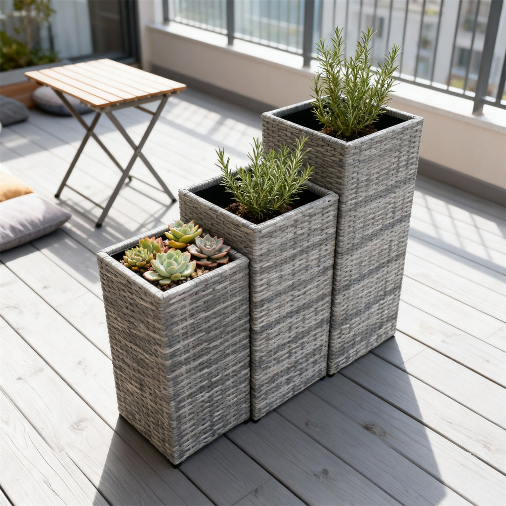 OPB250602 3-Piece Tall Square Grey Wicker Planter Set – Commercial Patio Plant Pot Set