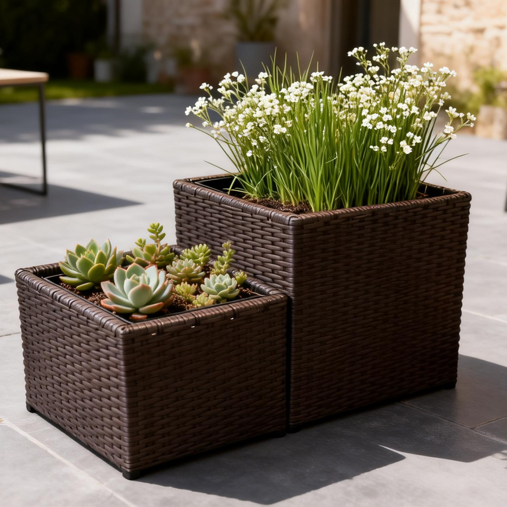 OPB2509 2-Piece Nesting Brown Wicker Planter Set – Modern Patio Raised Garden Bed