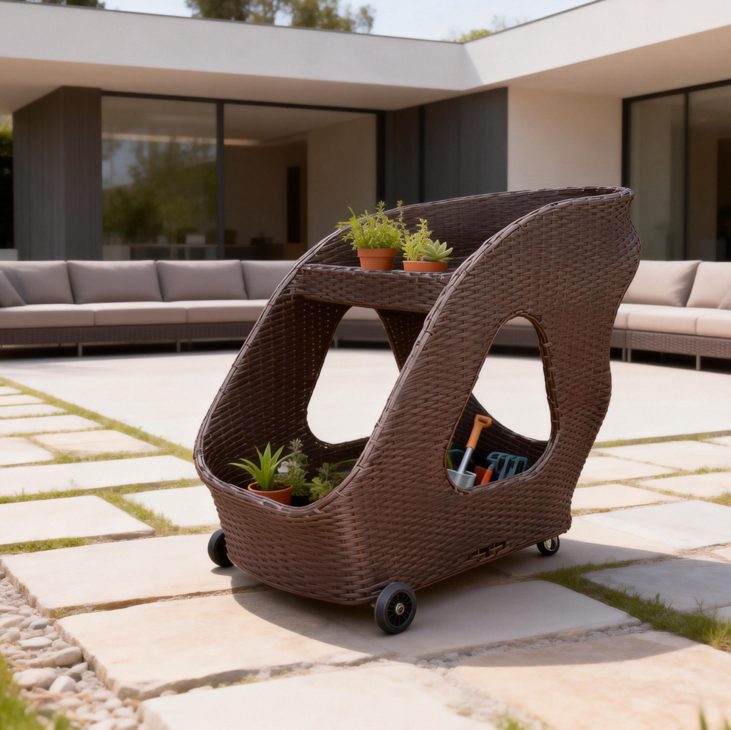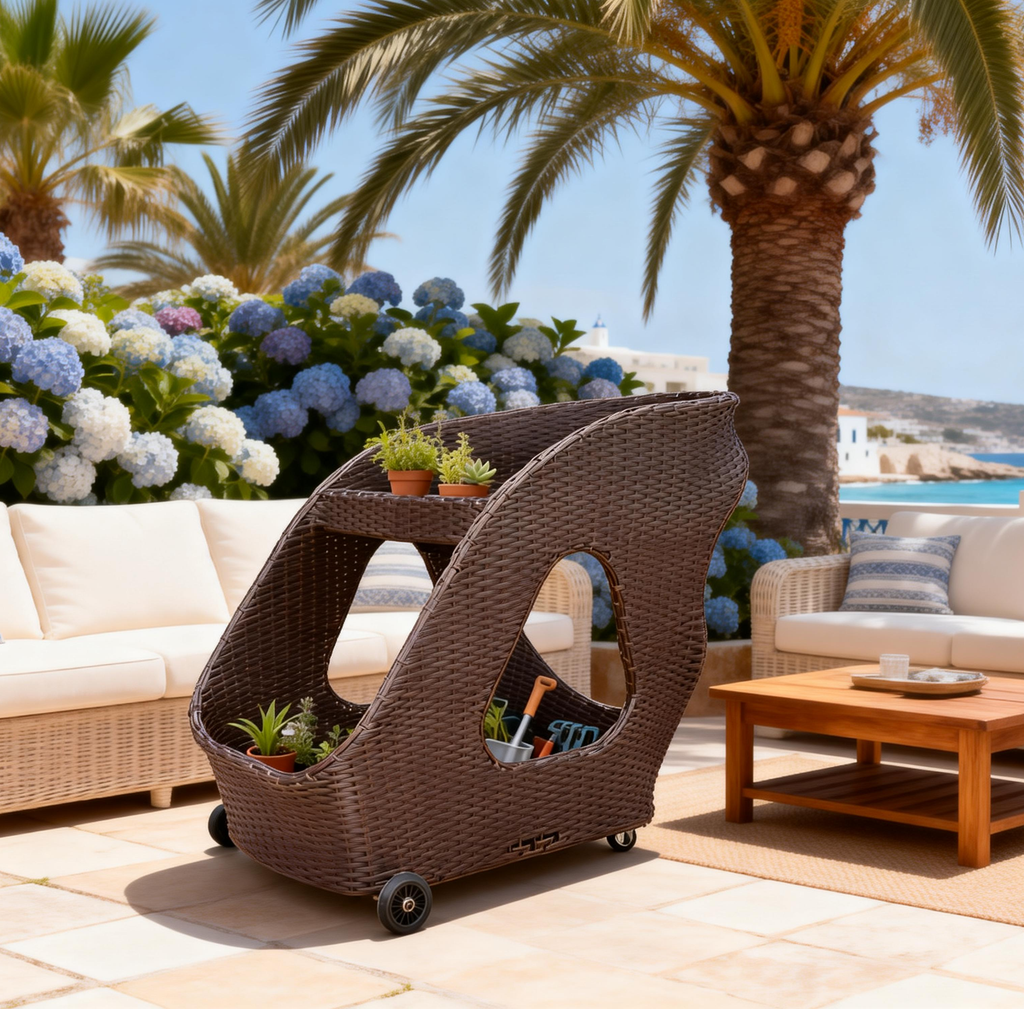 Ideal as a mobile garden station, patio planter display, or tool storage cart. Perfect for coastal villas, resort patios, or backyard gardens, blending functionality with eye-catching decorative appeal.