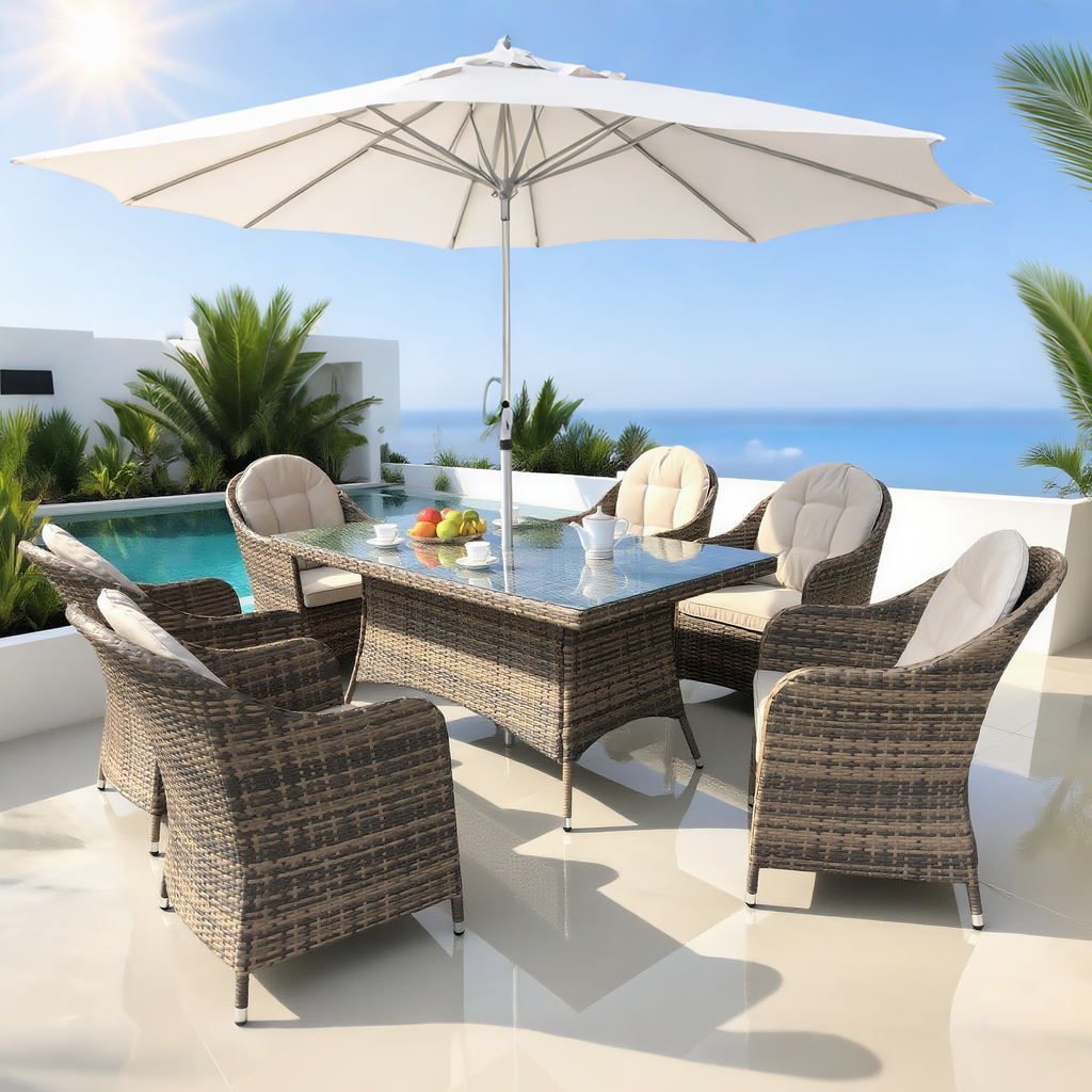 3. Versatile Luxury Dining Set with Umbrella – Perfect for Coastal Gatherings! The set includes six chairs, a clear glass square dining table, and a sun umbrella, providing ample space for family meals, friends’ gatherings, while shielding you from harsh sunlight. Blends coastal style and utility seamlessly, catering to various seaside outdoor social needs.