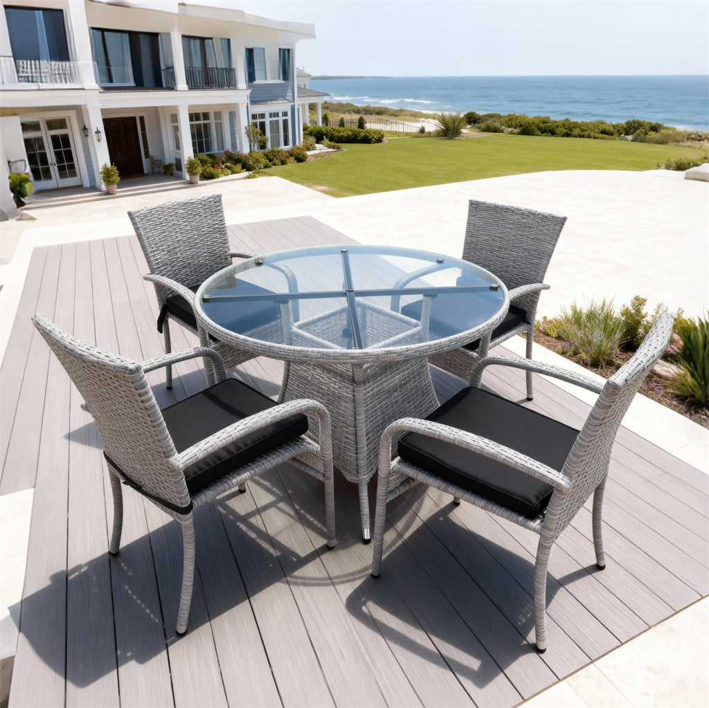 TBDS2523 Light Grey Wicker Modern Coastal Luxury Outdoor Dining Set with Black-Grey Cushions & Clear Glass Round Table – Stylish Patio Furniture