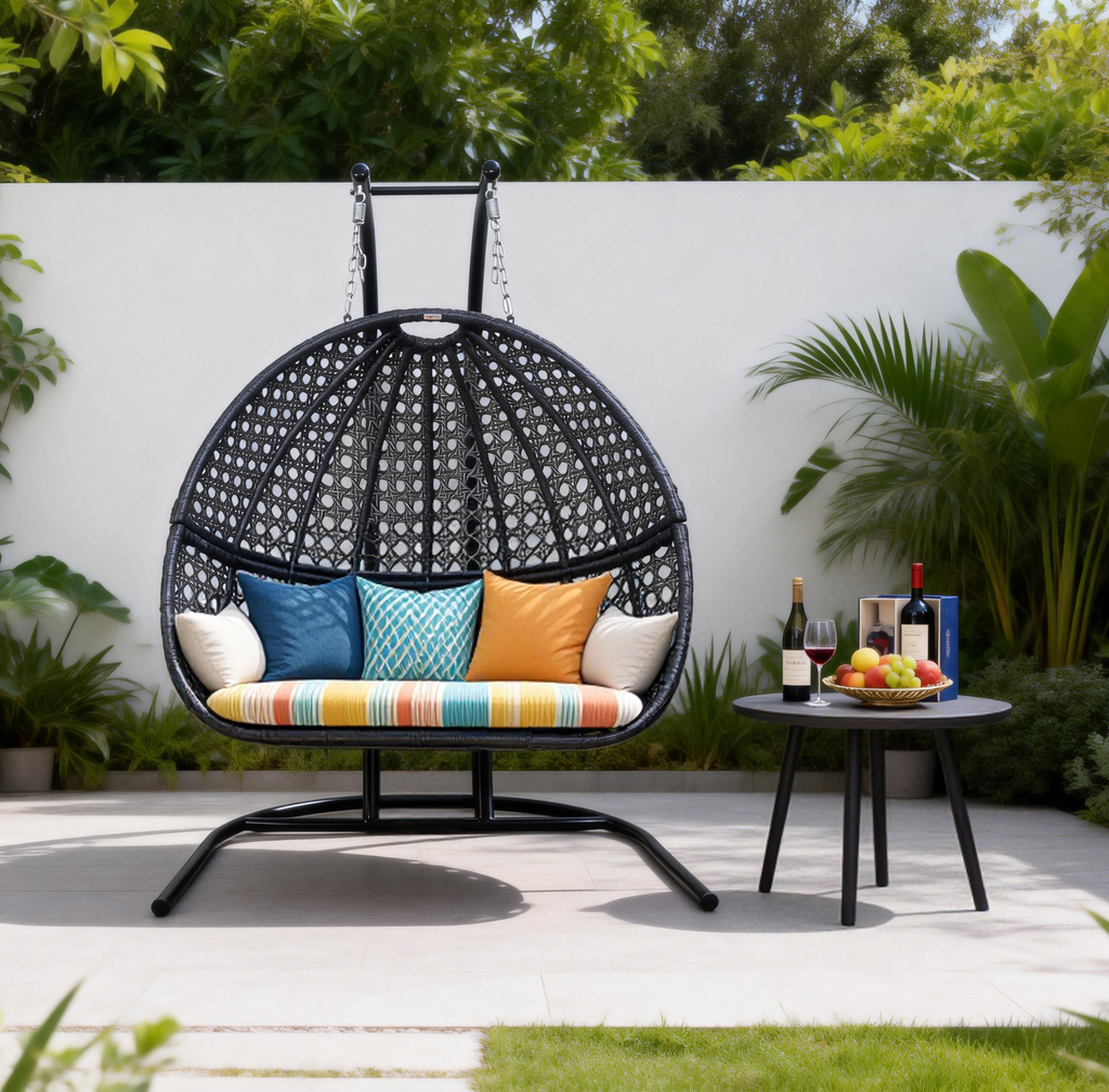SWC2604 2 Seater Black Wicker Hanging Egg Chair with Stand & Colorful Cushion – Patio Swing Lounge Set with Side Table
