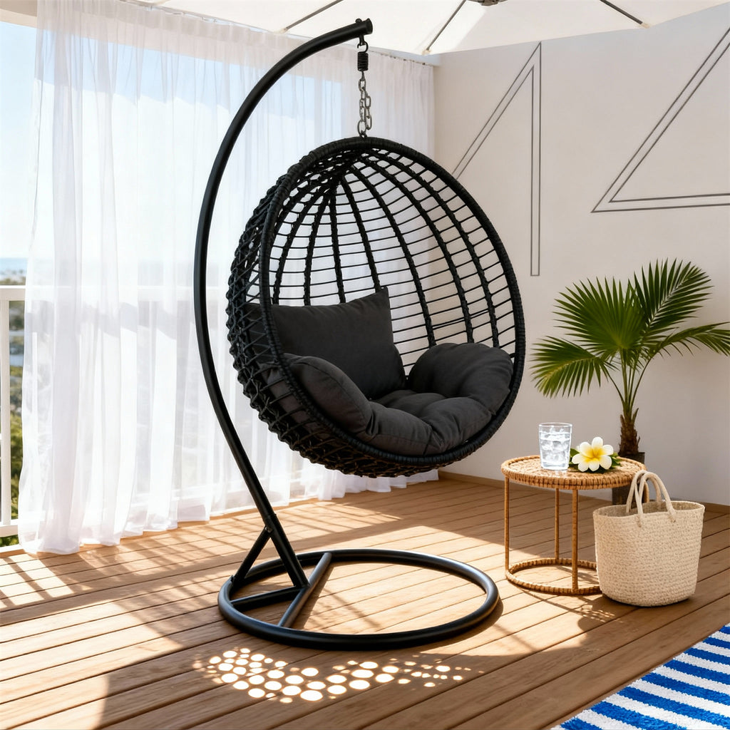 Hand-woven black PE rattan in a rounded, open-weave egg silhouette, paired with a sturdy C-shaped metal stand and durable hanging chain, delivering a smooth, gentle sway perfect for relaxing on patios, balconies, or sunrooms. The tight lattice weave adds a contemporary aesthetic while promoting airflow, keeping you cool on warm days.