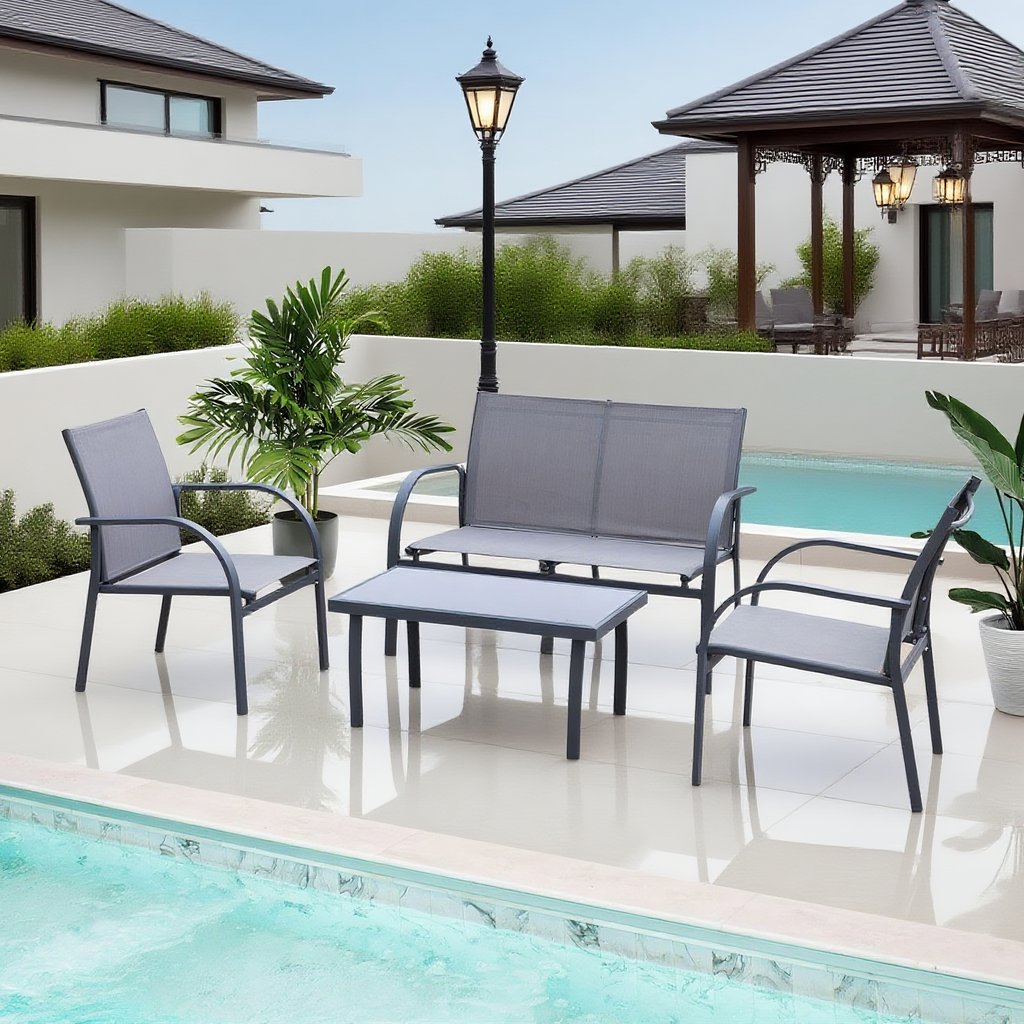 CBY2504 Black Metal & Grey Mesh Modern Poolside Luxury Outdoor Lounge Set (4-Piece) – Sleek Square Coffee Table