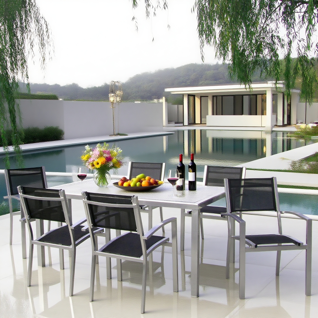 CBY250501 Silver Aluminum & Black Mesh Mountain-View Poolside Luxury Outdoor Dining Set (6-Piece) – Glass Rectangular Table