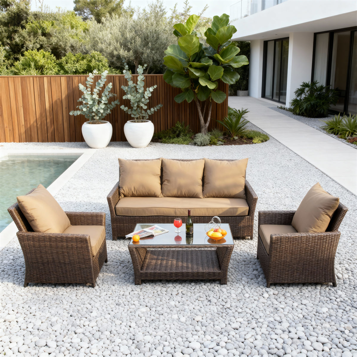 Dark Brown Wicker Outdoor Lounge Set with Tan Cushions & Glass Coffee Table – Stylish Patio Furniture