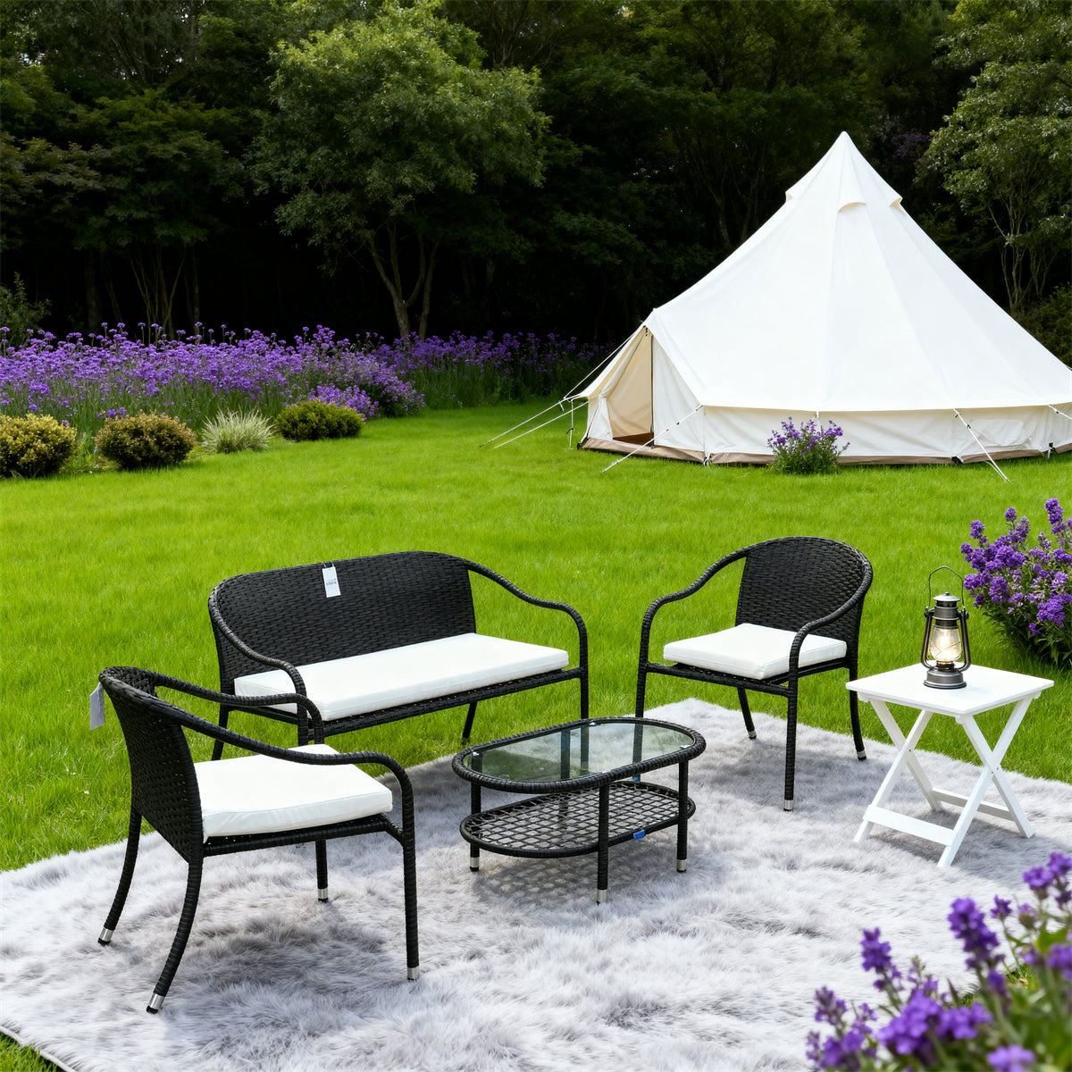 - Versatile Furniture Set – Tidy & Functional! The set includes two chairs, a loveseat, and a glass coffee table. The coffee table offers a surface for drinks, snacks, or decor, while the seating provides ample space for relaxation or socializing. Blends utility and style seamlessly, catering to various outdoor needs.