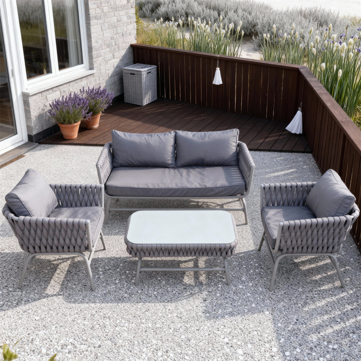 Dark Grey Woven Nordic Coastal Outdoor Lounge Set with Dark Grey Cushions & Clear Glass Coffee Table – Stylish Patio Furniture