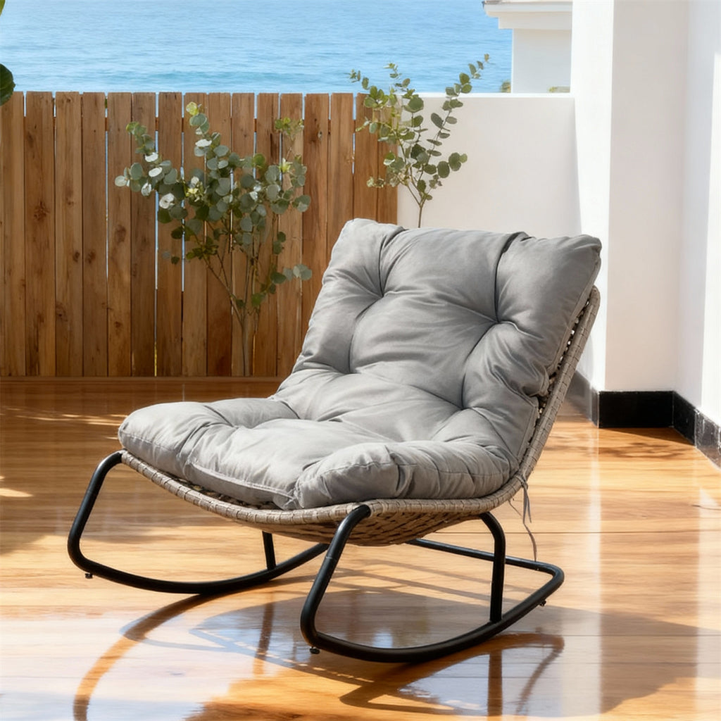 Hand-woven natural-toned wicker seat paired with a sleek black metal rocker base, creating a smooth, gentle gliding motion perfect for relaxing on coastal patios, balconies, or indoor living spaces. The minimalist silhouette blends contemporary style with organic texture, elevating any relaxation nook.