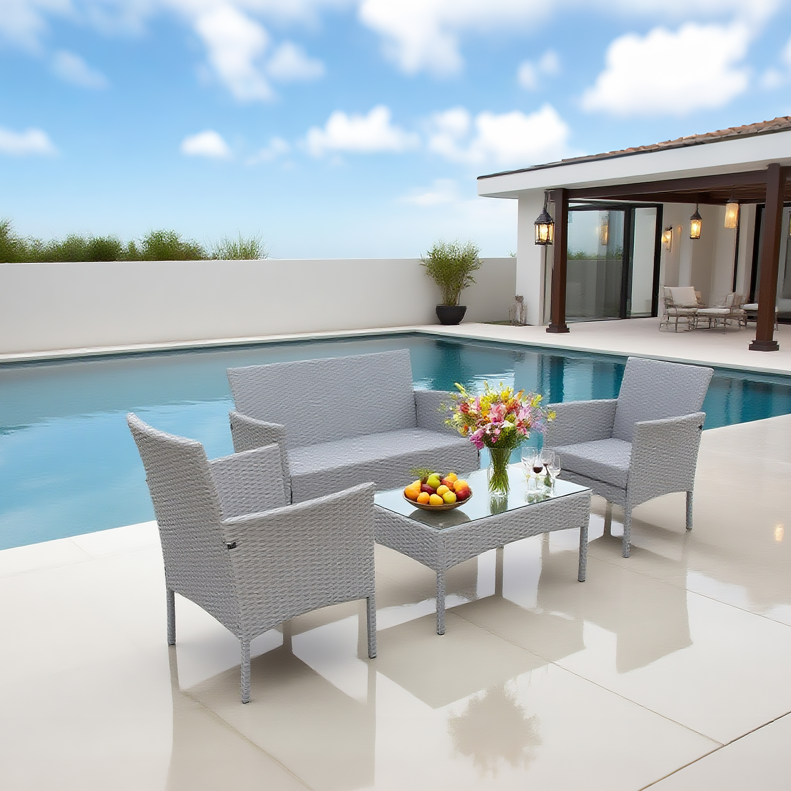 - Conversation - Focused Layout – Perfect for Socializing! The set includes two armchairs, a loveseat, and a glass coffee table, creating a cozy gathering spot by the pool or patio. Ideal for hosting friends, family chats, or relaxed outdoor meals—encourages meaningful interactions.