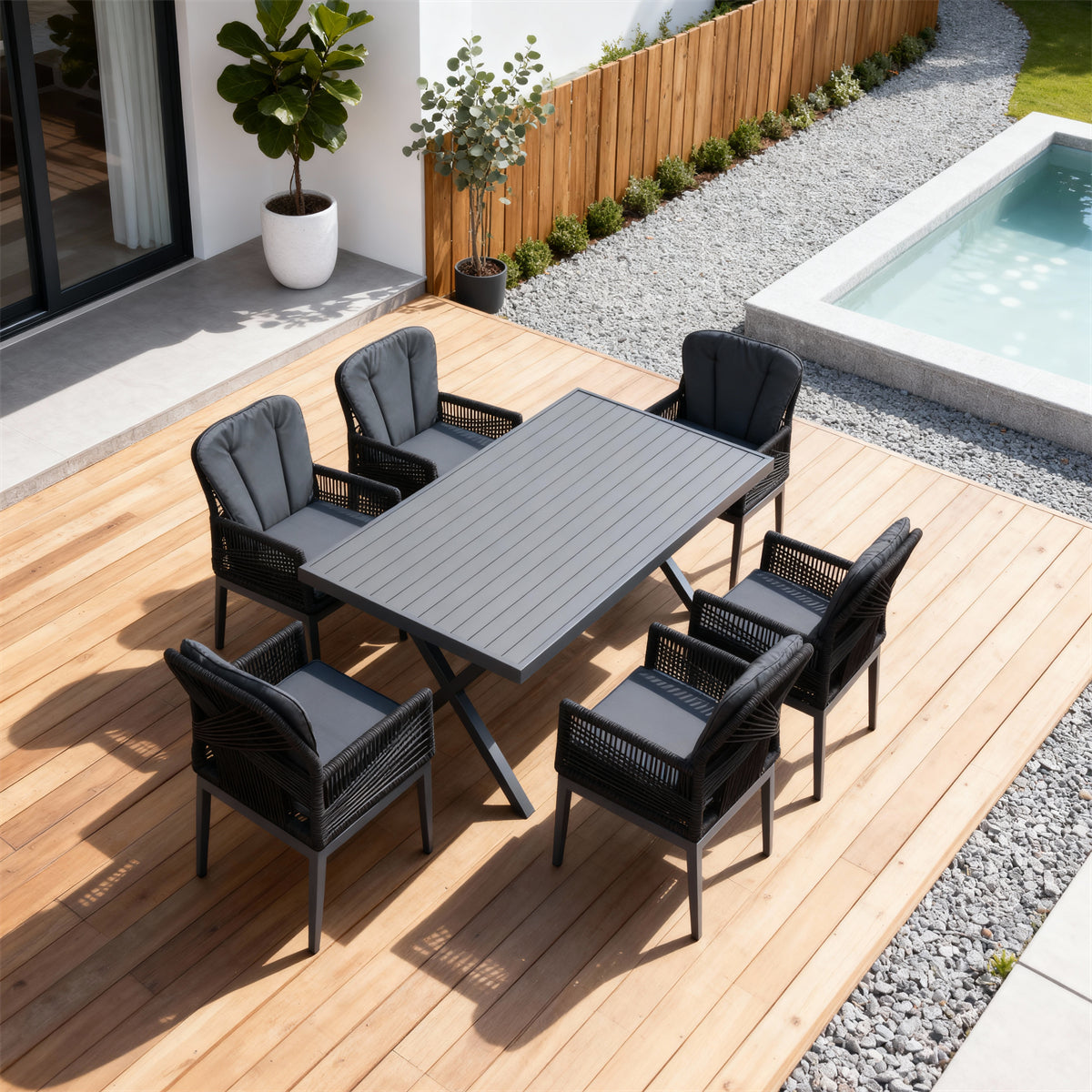 - 7-Piece 6-Seater Dining Set for Coastal Villa Gatherings! The 6-chair + 1-table configuration fits intimate luxury groups—ideal for Mediterranean seafood dinners、villa cocktail hours or seaside chats, turning your patio into a 6-guest high-end social hub.