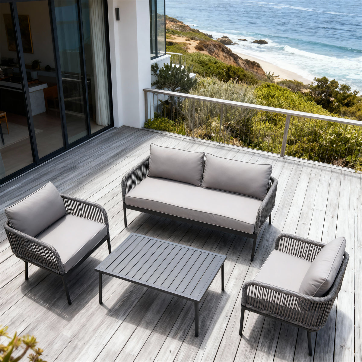 - 4-Piece Outdoor Lounge Set for Cliffside Villa Socializing! The 2-chair + 1-loveseat + 1-coffee-table configuration fits 4 guests—ideal for ocean-view brunches、sunset chats or casual coastal gatherings, turning your deck into a modern luxury social lounge.