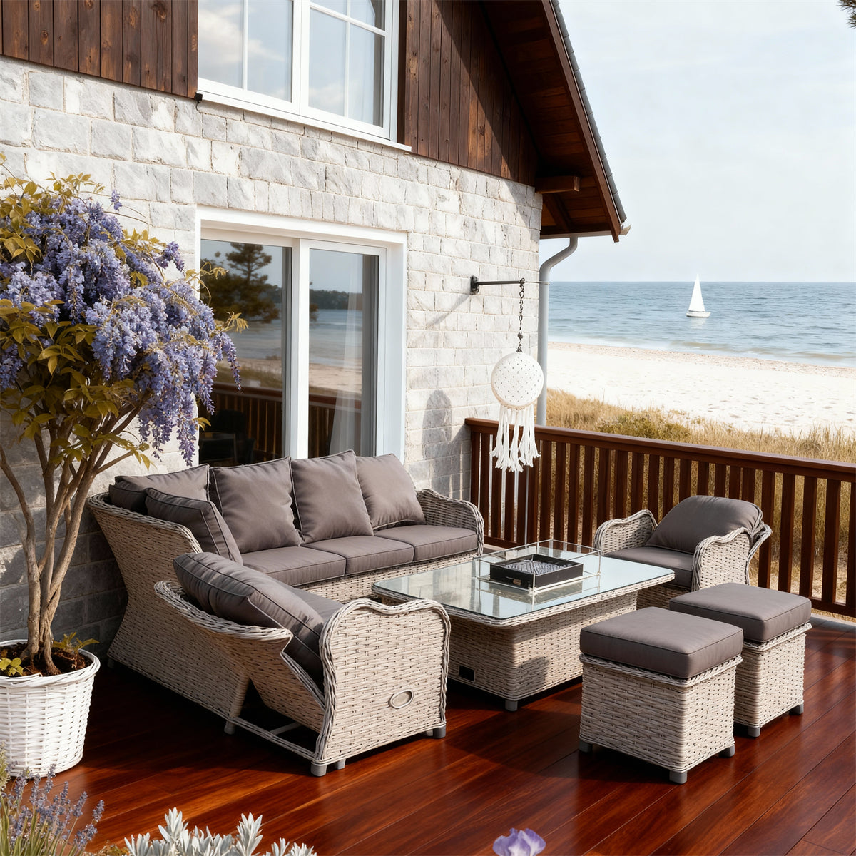 - 5-Piece L-Shaped Set for Coastal Cottage Gatherings! The L-sofa + glass table + ottomans configuration fits 4-6 guests—ideal for beach-view brunches、seaside chats or casual cottage lounging, turning your deck into a cozy luxury social hub.