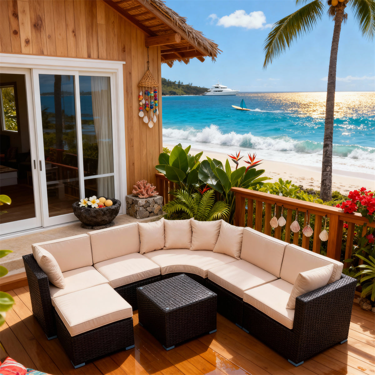 - Curved Modular Layout for Beachfront Decks! The flexible sectional pieces can be rearranged to fit your terrace’s shape—complementing palm trees、vibrant foliage and seashell decor, easily adapting to intimate moments or large groups.