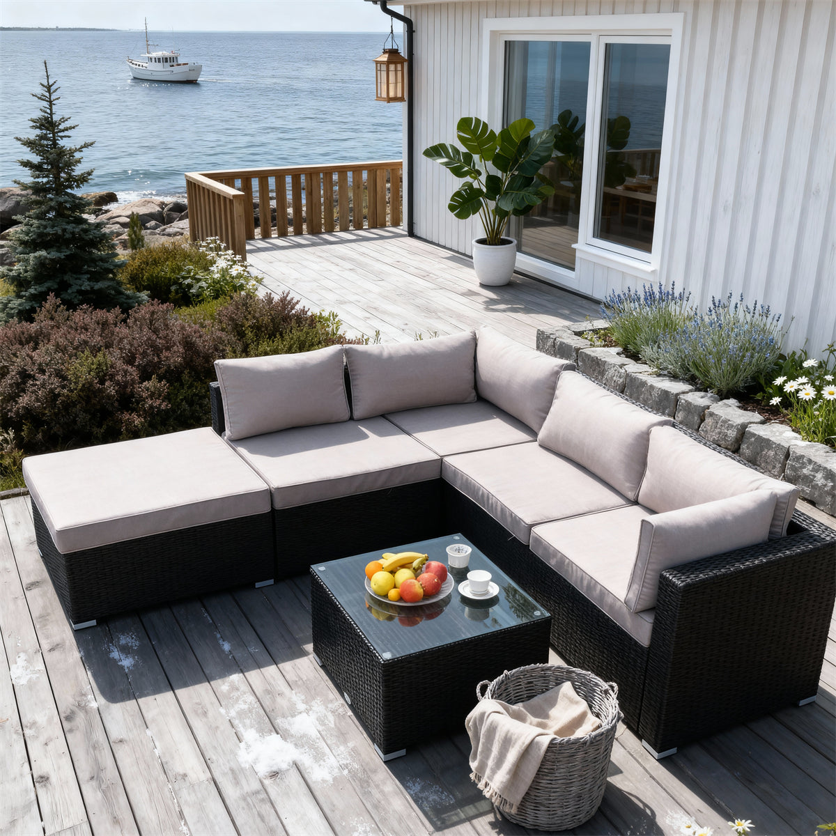 - 6-Piece L-Shaped Lounge Set for Coastal Cabin Gatherings! The sectional sofa + ottoman + coffee table configuration fits 5-6 guests—ideal for sea-view brunches、post-hike relaxation or boat-watching chats, turning your deck into a minimalist Scandinavian luxury social hub.