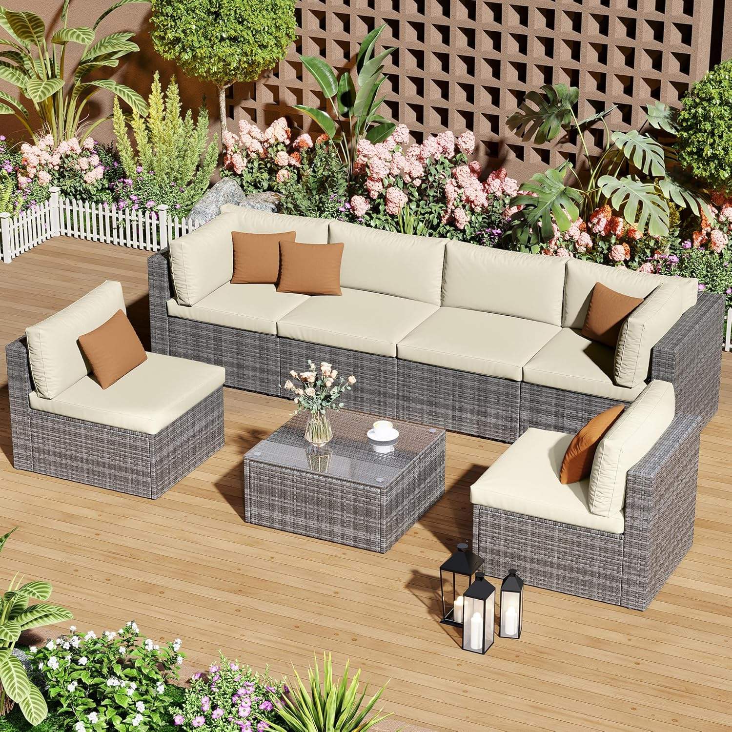 - 7-Piece Modular Lounge Set for Coastal Villa Gatherings! The sectional sofa + ottomans + table configuration fits 6-7 guests—ideal for yacht-view dinners、cliffside chats or post-hike relaxation, turning your deck into a sleek modern luxury social hub.