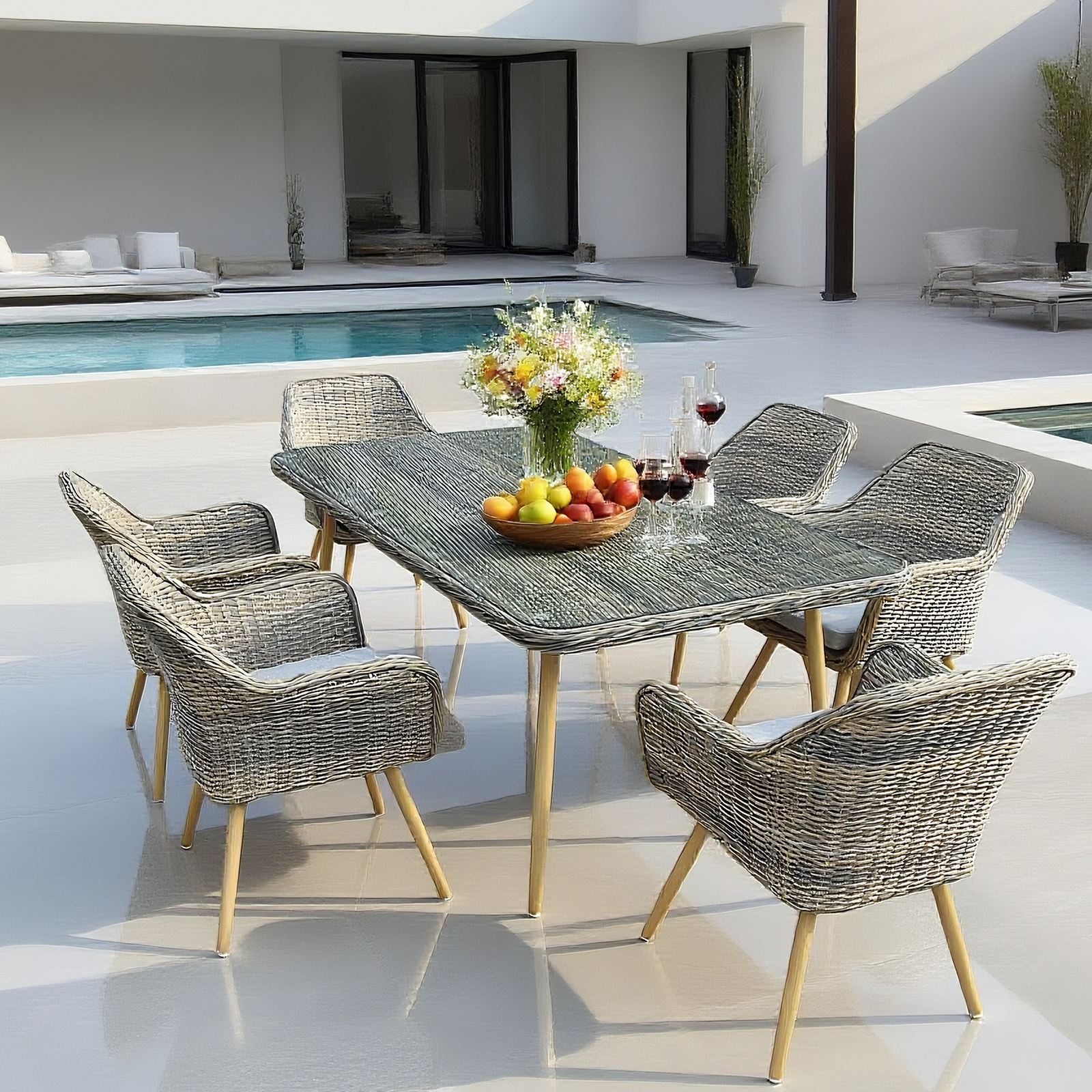 TBDS25106S Mixed Grey Wicker & Wooden Legs Modern Luxury Outdoor Dining Set with Light Grey Cushions & Clear Glass Rectangular Dining Table – Stylish Patio Furniture