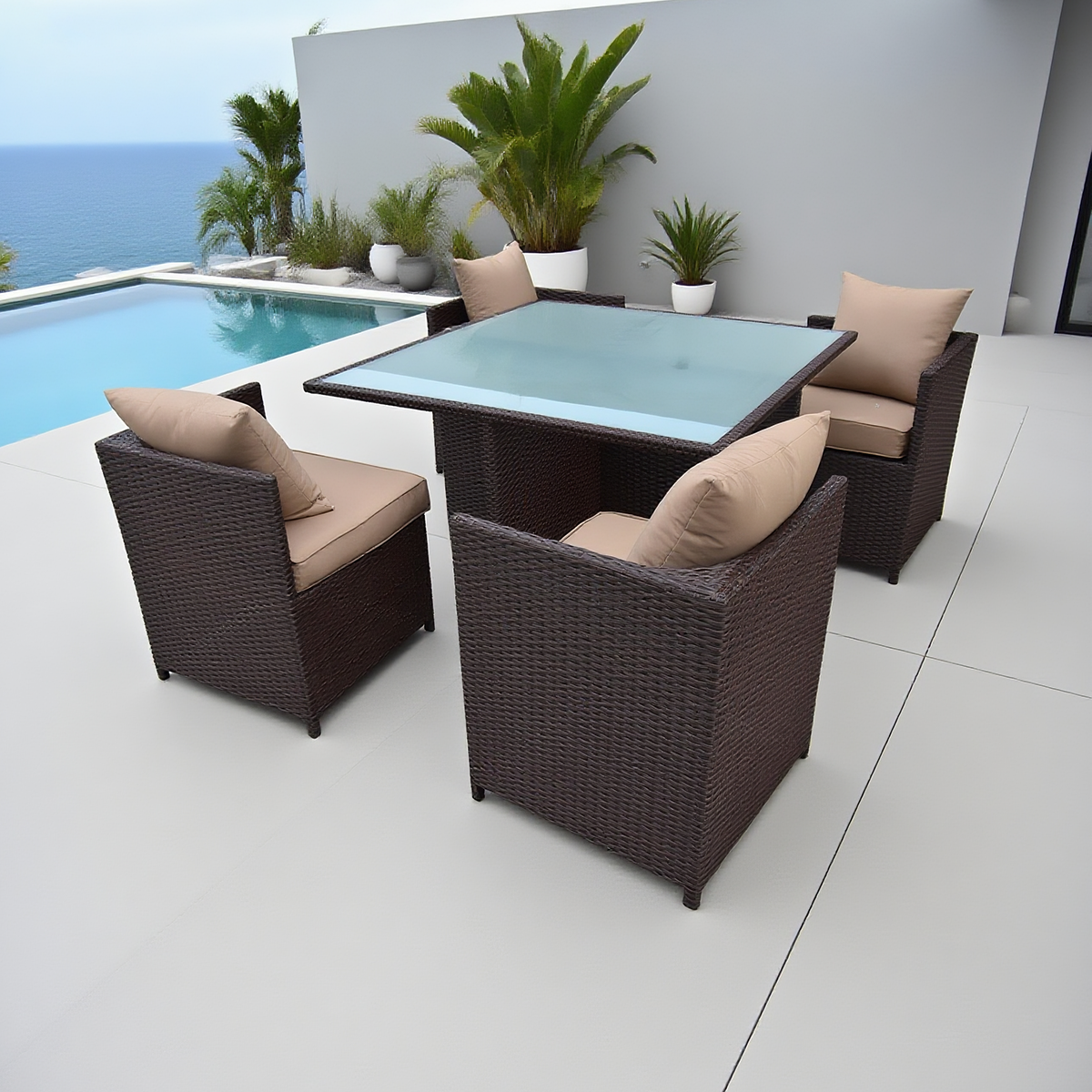 TBDS2515 Dark Brown Wicker Tropical Luxury Outdoor Dining Set with Beige Cushions & Light Blue Glass Rectangular Dining Table – Stylish Patio Furniture