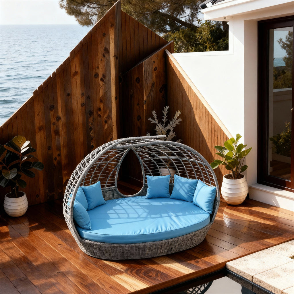 - Grey Rattan + Bright Blue Cushions for Cancun Style! The textured woven frame pairs with vivid blue bedding—blending with warm wood decks、turquoise lagoons and tropical foliage, adding a pop of coastal color while offering cool comfort for humid Mexican climates.