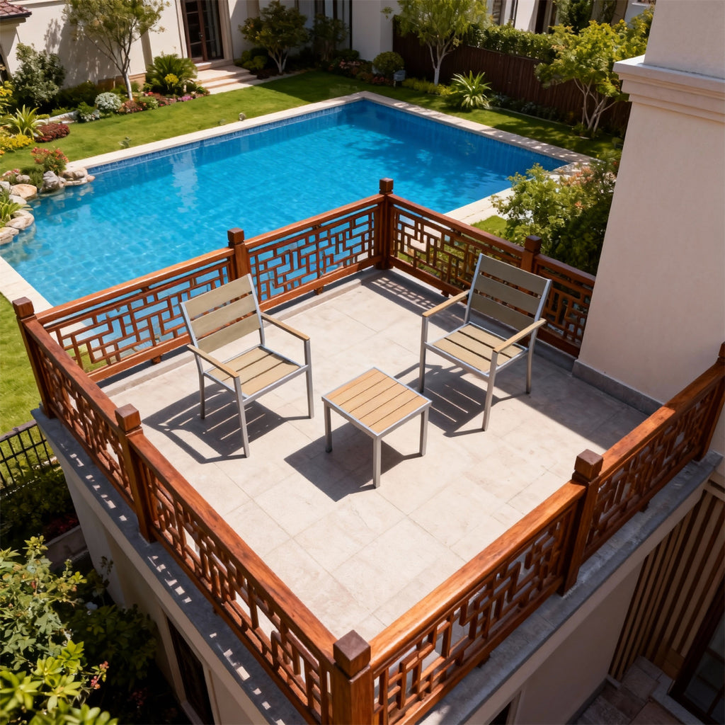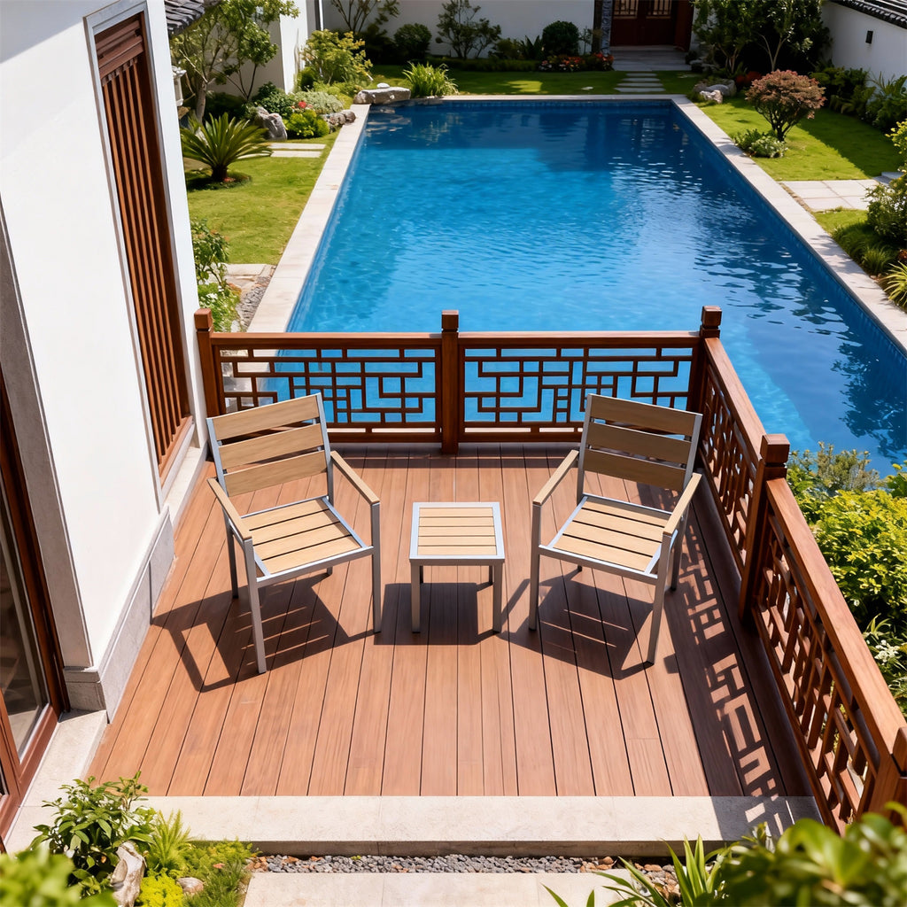 Clean, natural wood tones and minimalist lines complement traditional Chinese lattice railings, tranquil pool views, and lush greenery, evoking a serene, timeless Asian garden vibe.
